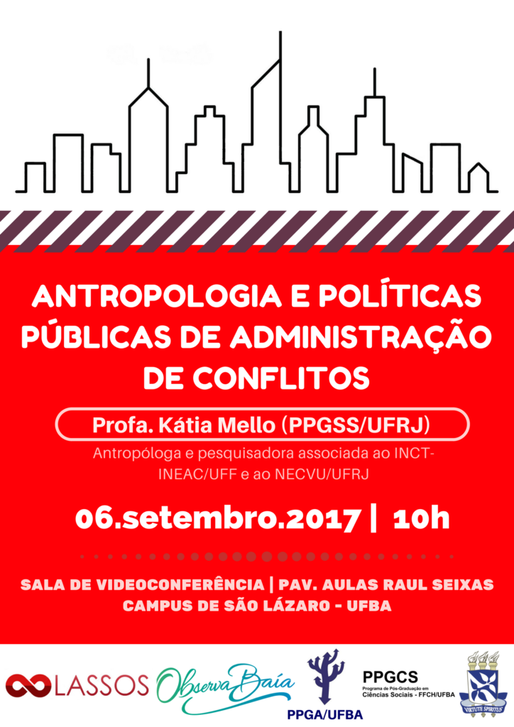 Divulgamos o seminário “Antropologia e Políticas Públicas de Administração de Conflitos”, com a Professora Kátia Sento Sé Mello (UFRJ), atividade organizada por nós, do Laboratório de Estudos Sobre Crime e Sociedade (LASSOS), e pelo Observatório de Riscos e Vulnerabilidades Sócio-ambientais da Baía de Todos os Santos (ObservaBaía), em parceria com o Programa de Pós-Graduação em Antropologia da Universidade Federal da Bahia.