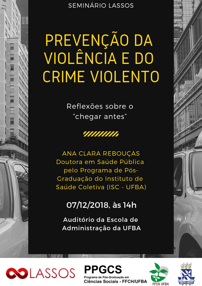 Convidamos a todos e todas para o Seminário LASSOS Prevençaõ da violência e do crime violento: reflexões sobre o “chegar antes”, no dia 07 de dezembro de 2018, às 14h, no auditório da Escola de Administração da UFBA, com participação de Ana Clara Rebouças, docente do Departamento de Odontologia Social e Pediátrica (UFBA) e doutora em Saúde Pública pelo Programa de Pós-Graduação do Instituto de Saúde Coletiva da Universidade Federal da Bahia (ISC/UFBA).