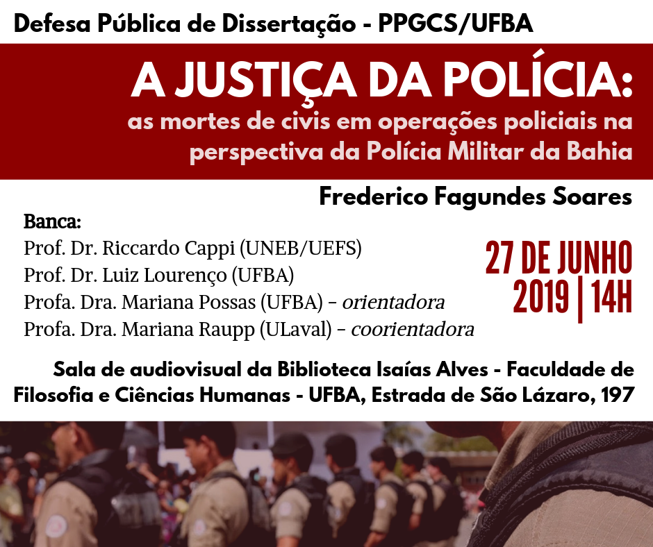 Convidamos a todos para a banca de defesa da dissertação de mestrado de Frederico Fagundes Soares, discente do Mestrado em Ciências Sociais da Universidade Federal da Bahia (UFBA) e integrante do LASSOS, com o trabalho intitulado “A justiça da Polícia: mortes de civis em operações policiais na perspectiva da Polícia Militar da Bahia”, sob orientação da Professora Mariana Thorstensen Possas.