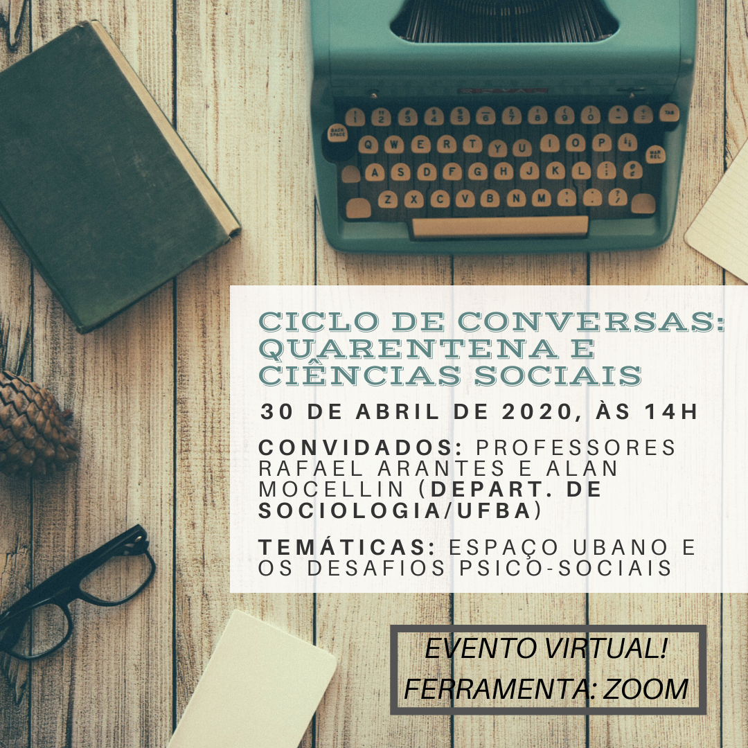 Informamos a todas(os) da da realização do evento virtual “Ciclo de Conversas: Quarentena e Ciências Sociais“, com sua primeira sessão a ocorrer no dia 30/04/2020, às 14h. Entendemos que, para esse momento difícil, é importante nos encontrarmos e mantermos o exercício intelectual. Assim, por meio de uma parceria entre os professores vinculados ao LASSOS e outros membros do corpo docente da UFBA e intelectuais de outras instituições acadêmicas, buscamos desenvolver mais esta forma de conexão e trocas. Mais informações abaixo:
