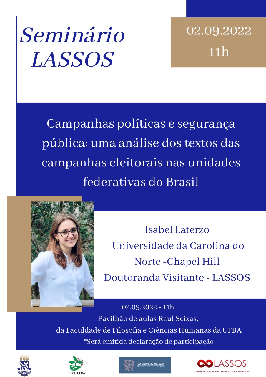 Convidamos a todos para o seminário LASSOS “Campanhas Políticas e Segurança Pública: Uma Análise dos Textos das Campanhas Eleitorais nas Unidades Federativas do Brasil”, no dia 02 de setembro, às 11h, com a participação de Izabel Laterzo, doutoranda visitante no laboratório.